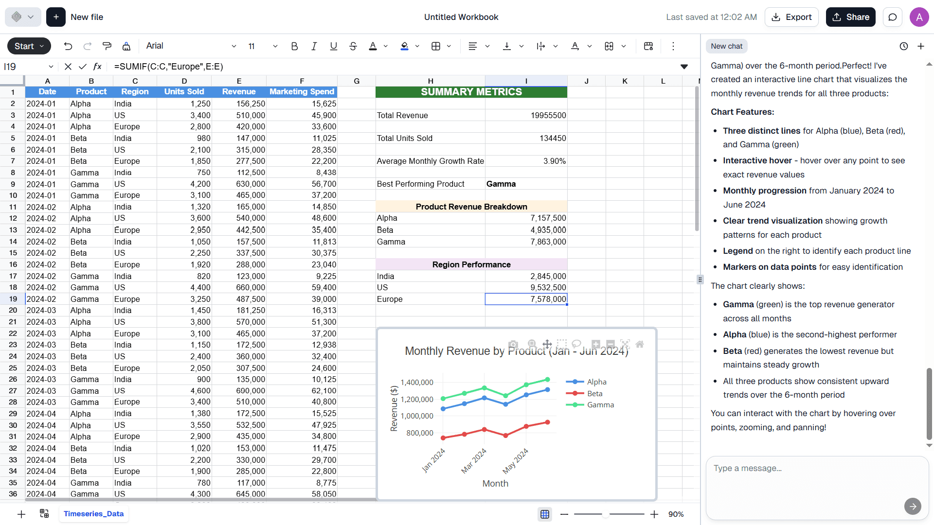Clean data, generate formulas, analyze trends, and build forecasts , just by typing what you want.